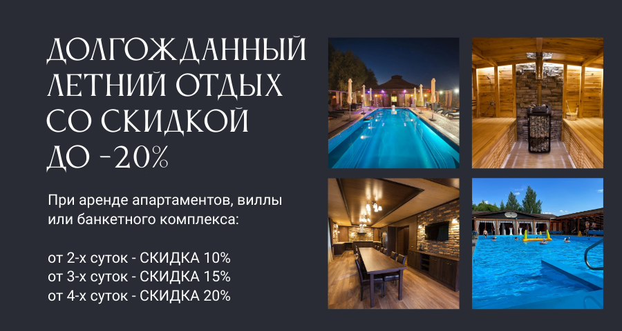 Скидки распространяются на все апартаменты, виллы с русской баней от базовой цены.